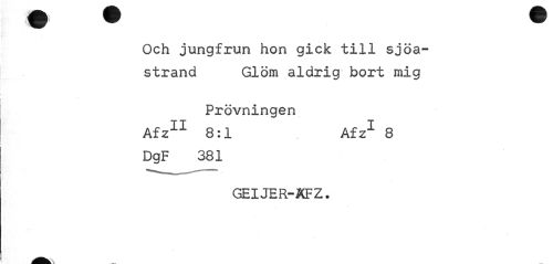 //// Och jungfrun hon gick till sjöastrand Glöm aldrig bort mig //// Prövningen Afz11 8:1 . Afz1 8 //// DgF 381 //// GEIJER-KFZ. ////