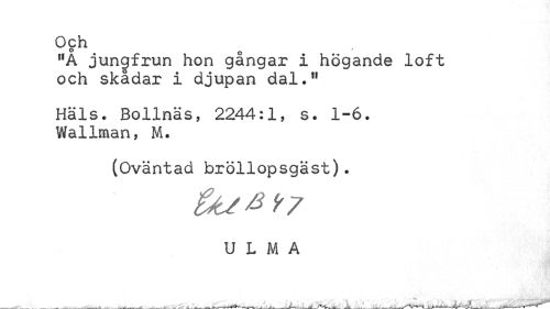 //// Och //// "A jungfrun hon gangar i högande loft och skådar i djupan dal." //// Hals. Bollnäs, 2244:1, s. 1-6. Wallman, M. //// (Oväntad bröllopsgäst). //// U L M A //// . .. ___. _ ---„ —i -^rJL___- ////