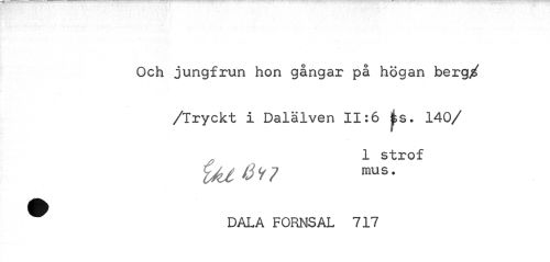 //// Och jungfrun hon gångar på högan berg/ //// /Tryckt i Dalälven 11:6 |s. 140/ //// 1 strof //// WU 6*7 raus* //// ^ DALA FORNS AL 717 ////