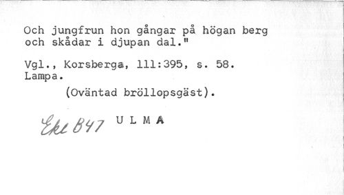 //// Och jungfrun hon gångar på högan berg och skådar i djupan dal." //// Vgl., Korsberga, 111:395, s. 58. Lampa. //// (Oväntad bröllopsgäst). //// tu697 ULMA //// V| //// I ////