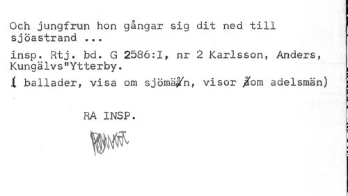 //// Och jungfrun hon gångar sig dit ned till sjöastrand ... //// insp. Rtj. bd. G 2586:1, nr 2 Karlsson, Anders, Kung älvs11 Yt te r by. //// i ballader, visa om sjömäifn, visor Jfom adelsmän) //// RA INSP. //// i //// ; ////