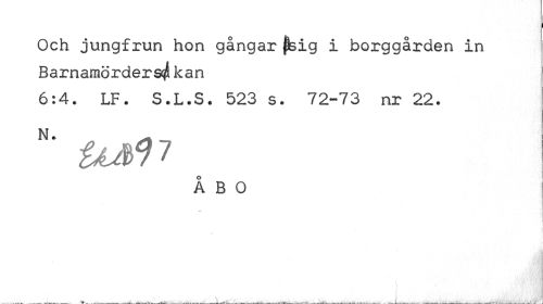 //// , //// Och jungfrun hon gångar |feig i borggården in Barnaraördersp kan //// 6:4. LF. S.L.S. 523 s. 72-73 nr 22. //// utf 1 //// ÅBO //// I //// t //// ¦ ////