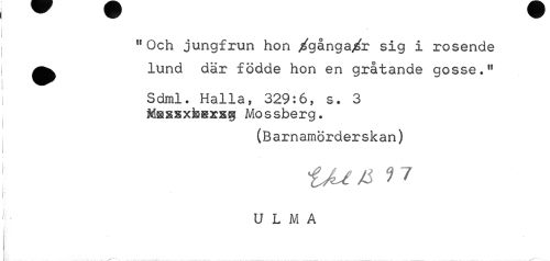 //// "Och jungfrun hon /gånga/r sig i rosende ^^ lund dar födde hon en gråtande gosse." //// Sdral. Halla, 329:6, s. 3 Msssxfegrsg Mossberg. //// (Barnamörderskan) U L M A ////