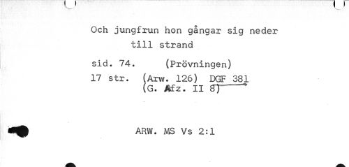 //// Och jungfrun hon gångar sig neder //// till strand //// sid. 74. (Prövningen) //// 17 str. (Arw. 126) DGF 381 //// (G. Afz. II 87 //// tfjft ARW. MS Vs 2:1 //// 1 ////
