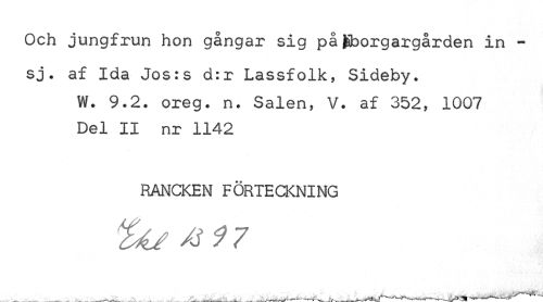 //// Och jungfrun hon gångar sig på ^borgargården in - //// sj. af Ida Jos:s d:r Lassfolk, Sideby. //// W. 9.2. oreg. n. Salen, V. af 352, 1007 Del II nr 1142 //// RANCKEN FÖRTECKNING ////