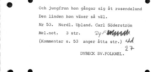 //// Och jungfrun hon gångar sig åt rosendelund Den linden hon växer så väl. Nr 53. Nordl. Upland. Carl Söderström Mel.not. 3 str. //// (Kommentar s. 53 anger atta str. ) äjj //// DYBECK SV.FOLKMEL. ////