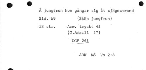 //// Å jungfrun hon gångar sig åt sjögestrand Sid. 69 (Skön jungfrun) //// o. //// 18 str. Arw. tryckt 41 //// (G.Afz ill 17) //// DGF 241 //// ARW MS Vs 2:3 ////