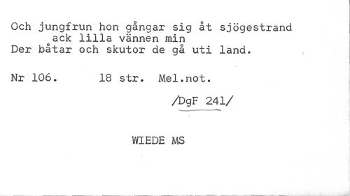 //// Och jungfrun hon gångar sig åt sjögestrand //// o ack lilla vännen min Der båtar och skutor de gå uti land. //// Nr 106. 18 str. Mel.not. //// /DgF 241/ //// t //// WIEDE MS ////