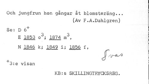 //// ! //// Och jungfrun hon gångar åt blomsteräng... ' //// (Av F.A.Dahlgren) //// Se: D 6+ i //// E 1853 o3; 1874 m3, I //// _ ¦ ...i //// N 1846 k; 1849 i; 1856 f, j //// JJ 1/-&S? j //// -f ^ i 3:e visan //// KB:s SKILLINGTRYCKSREG. //// i ////