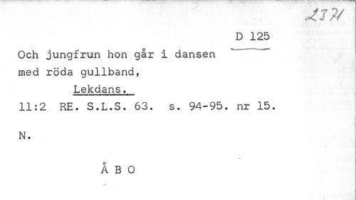 //// M?/ //// D 125 //// Och jungfrun hon går i dansen "* med röda gullband, //// Lekdans. //// 11:2 RE. S.L.S. 63. s. 94-95. nr 15. N. //// / //// ÅBO ////