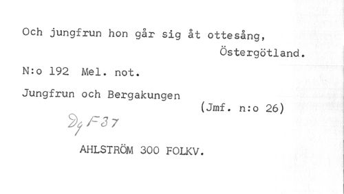//// Och jungfrun hon går sig åt ottesång, //// Östergötland. //// N:o 192 Mel. not. Jungfrun och Bergakungen //// (Jmf. n:o 26) //// %F37 //// AHLSTRÖM 300 FOLKV. ////