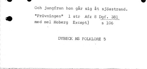 //// Och jungfrun hon går sig åt sjöastrand. //// ^ "Prövningen" 1 str Afz 8 Dgf. 381^ //// ^^ med mel Moberg Hxcept) s 106 //// } //// DYBECK MS FOLKLORE 5 //// t ////