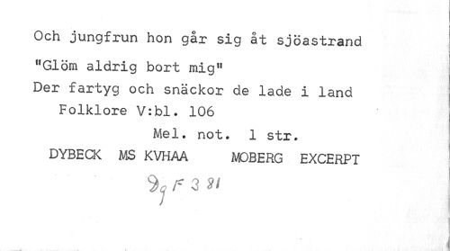 //// i //// I //// Och jungfrun hon går sig åt sjöastrand //// i //// "Glöm aldrig bort mig" Der fartyg och snäckor de lade i land Folklore V:bl. 106 //// Mel. not. 1 str. DYBECK MS KVHAA MOBERG EXCERPT //// % F 2 91 ////