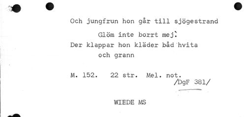//// Och jungfrun hon går till sjögestrand //// Glöm inte borrt mej^ Der klappar hon kläder båd "hvita //// och grann //// M. 152. 22 str. Mel. not. //// /DgF 381/ //// WIEDE MS ////