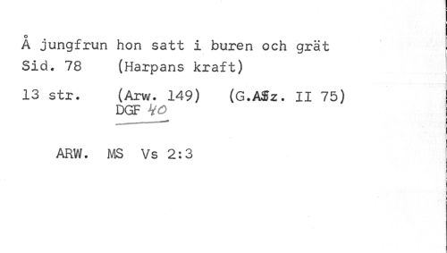 //// o //// A jungfrun hon satt i buren och grät Sid. 78 (Harpans kraft) //// 13 str. (Arw. 149) (G.Affz. II 75) //// DGFjVö //// ARW. MS Vs 2:3 ' //// - ////