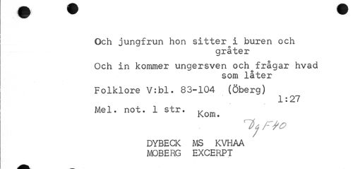 //// Och jungfrun hon sitter i buren och //// gråter //// Och in kommer ungersven och frågar hvad //// som låter //// Folklore V:bl. 83-104 (Öberg) //// 1 * 2,7 //// Mel. not. 1 str. l^om. //// DYBECK MS KVHAA MOBERG EXCERPT ////