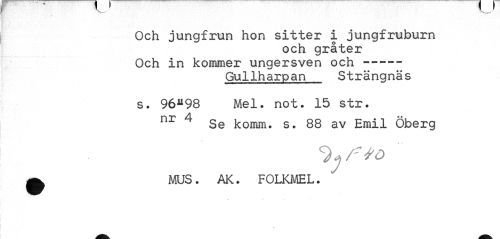 //// Och jungfrun hon sitter i jungfruburn //// och gråter //// Och in kommer ungersven och ---— //// Gullharpan Strängnäs //// s. 96^98 Mel. not. 15 str. //// nr 4 Se komm. s. 88 av Emil Öberg //// 9« /r to //// 0 MUS. AK. FOLKMEL. //// é ////