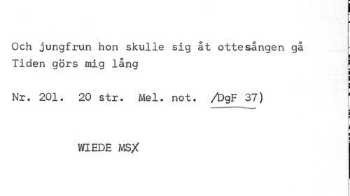 //// I //// / //// Och jungfrun hon skulle sig åt ottesången gå //// ! //// Tiden görs mig lång \ //// Nr. 201. 20 str. Mel. not. /DgF 37) //// ¦ //// ! //// > i //// 1 //// WIEDE MS/ //// [ //// ' -i ////