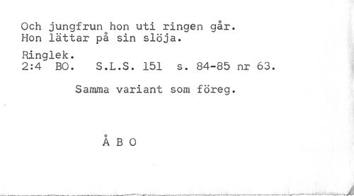 //// Och jungfrun hon uti ringen går. Hon lättar på sin slöja. //// Ringlek. //// 2:4 BO. S.L.S. 151 s. 84-85 nr 63. //// Samma variant som föreg. //// 4 //// ÅBO ////
