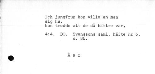 //// Och jungfrun hon ville en man sig ha, //// hon trodde att de då bättre var, //// 4:4, BO, Svenssons saml. häfte nr 6. //// s. 86. //// ^ ÅBO ////