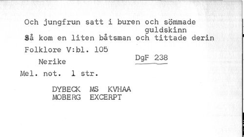 //// Och jungfrun satt i buren och sömmade //// guldskinn //// Så kom en liten båtsman och tittade derin ! //// Folklore V:bl. 105 //// Nerike D9F g38 //// Mel. not. 1 str. //// DYBECK MS KVHAA MOBERG EXCERPT ////