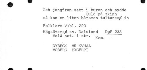 //// Och jungfrun satt i buren och sydde //// oGuld på skinn så kom en liten båtsman tultanes^T in //// Folklore V:bl. 220 //// Högsäters/1 sn, Dalsland DgF 238 Melå not. 1 str. //// Kom. //// DYBECK MS KVHAA MOBERG EXCERPT //// v ////