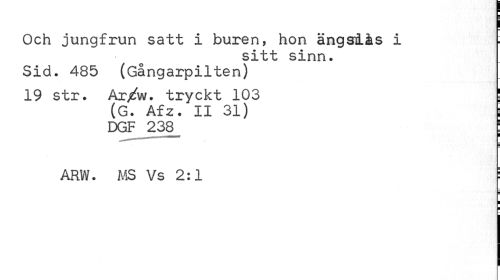 //// Och jungfrun satt i buren, hon ängsiås i //// sitt sinn. Sid. 485 (Gångarpilten) //// 19 str. Ar/w. tryckt 103 ! //// (G. Afz. II 31) | //// DGF 238_ //// ARW. MS Vs 2:1 : ////