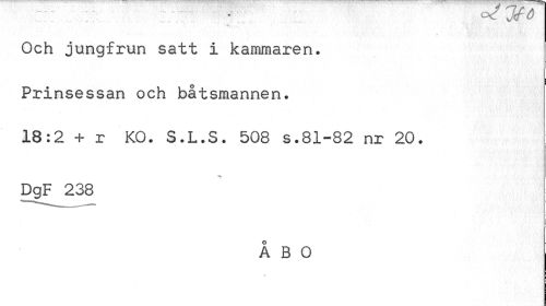//// * tfl k / Och jungfrun satt i kammaren. //// Prinsessan och båtsmannen. //// 18:2 + r KO. S.L.S. 508 s.81-82 nr 20. //// DgF 238 //// ÅBO ////