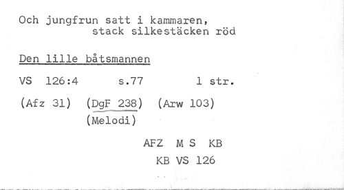 //// Och jungfrun satt i kammaren, //// stack silkestäcken röd //// Den lille båtsmannen //// VS 126:4 s.77 1 str. //// (Afz 31) (DgF 238) (Arw 103) //// (Melodi) //// AFZ M S KB //// KB VS 126 //// ¦ * ////