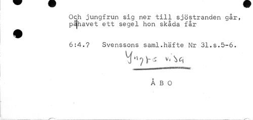 //// Och jungfrun sig ner till sjöstranden går, påjhavet ett segel hon skåda får //// 6:4.? Svenssons saml.häfte Nr 31.s.5-6. //// ÅBO //// J^^i. _ . ... ' ---v ////