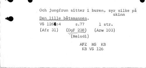 //// . Och jungfrun sitter i buren, syr silke på //// skinn //// Den lille båtsmannen. VS 126lfi:4 s .77 1 str. //// (Afz 31) (DgF 238) (Arw 103) //// (Melodi) //// AFZ MS KB KB VS 126 ////