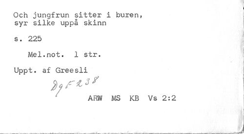 //// I //// I //// Och jungfrun sitter i buren, syr silke uppå skinn //// l //// s. 225 //// 1 » //// Mel.not. 1 str. i //// ; I //// * //// 5 //// Uppt. af Greesli //// fyr*3' //// ARW MS KB Vs 2:2 //// jh //// ---"---—- - — --- ---i,--¦---it---,---__t___-_tfttth___---,-MMlMU__.___— - _¦_,__ .. . ___«_,___ ////