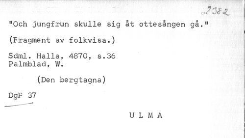 //// "Och jungfrun skulle sig åt ottesången gå." //// (Fragment av folkvisa.) //// Sdml. Halla, 4870, s.36 Palmblad, W. //// (Den bergtagna) //// DgF 37 //// U L M A ////