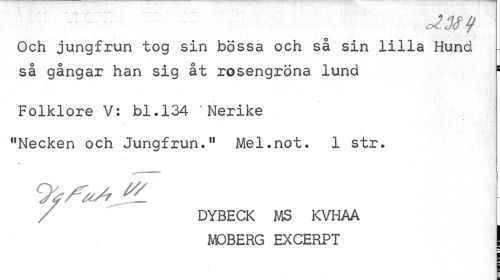 //// Och jungfrun tog sin bössa och så sin lilla Hund så gångar han sig åt rosengröna lund 1 //// Folklore V: bl.134 ' Nerike "Necken och Jungfrun.11 Mel.not. 1 str. //// 9//^ k. - //// DYBECK MS KVHAA [ //// MOBERG EXCERPT I ////