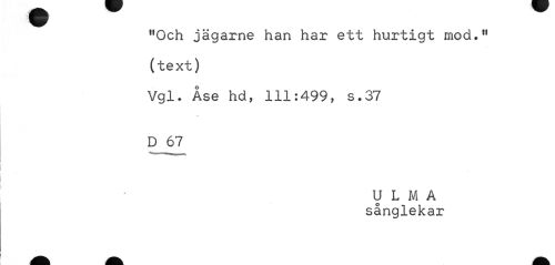 //// "Och jägarne han har ett hurtigt mod," (text) //// Vgl. Åse hd, 111:499, s.37 D 67 //// U L M A sånglekar ////