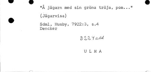 //// o ^^ //// "A jägarn med sin gröna tröja, pom...H //// •r. //// (Jägarvisa) //// ^ Sdml, Husby, 7922:3, s.4 //// Dencker //// IIIHclM U L M A ////