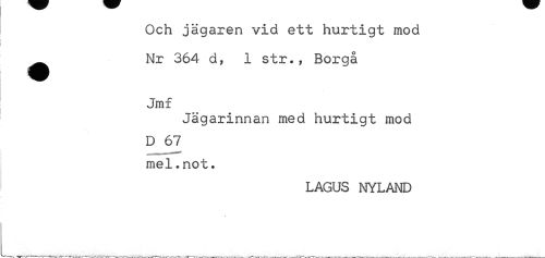 //// Och jägaren vid ett hurtigt mod ^^ Nr 364 d, 1 str., Borgå //// Jmf //// Jägarinnan med hurtigt mod //// D 67 mel.not. //// LAGUS NYLAND ////
