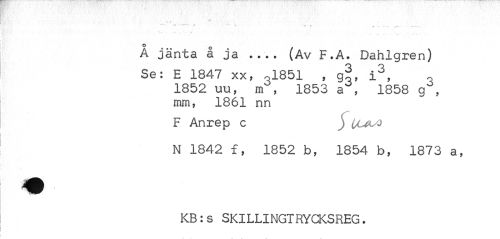 //// « n //// fl 7» i* - r - - — ¦ r*—--s. - //// O - ^ //// A jänta a ja ... (Av F.A. Dahlgren) //// Se: E 1847 xx, ^1851 , g?, i3, o 1852 uu, 1853 a , 1858 g , //// mm, 1861 nn //// F Anrep c ) i/^oo //// N 1842 f, 1852 b, 1854 b, 1873 a, //// KB:s SKILLINGTRYCKSREG. ////