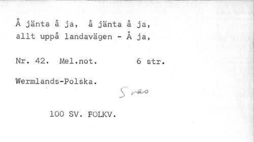 //// Å jänta å ja, å jänta å ja, allt uppå landavägen - Å ja, //// Nr. 42. Mel.not. 6 str. //// Wermlands-Polska. //// 100 SV. FOLKV. //// ¦ vy! //// ¦ //// 1 ////