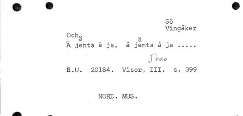 //// • I //// SÖ //// Vingåker //// Och.. //// a a o //// A jenta å ja, a jenta a ja ... //// E.U. 20184. Visor, III. s. 399 //// NORD. MUS. ////
