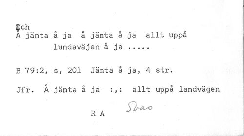 //// I //// ®ch //// A jänta å ja å jänta å ja allt uppå //// lundaväjen å ja ... //// B 79:2, s, 201 Jänta å ja, 4 str. //// Jfr. Å jänta å ja :,: allt uppå landvägen //// RA ////