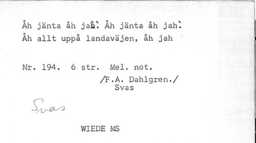 //// " //// Åh jänta åh jak* Åh jänta åh jatw //// o //// Ah allt uppå landaväjen, åh jah " //// t ";.¦"'! //// Nr. 194. 6 str. Mel. not. //// /F.A. Dahlgren./ Svas //// WIEDE MS ////
