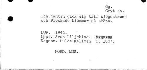 //// Ög. //// Gryt sn• //// •Och jäntan gick sig till sjögestrand och Plockade blommor så sköna. //// LUF. 1946. //// Uppt. Sven Liljeblad. Sh^kxäk Sagesm. Hulda Kellman f. 1S37. //// NORD. MUS. //// \ //// * i //// • I ' . * V^^ i" » t IT— -r"^*»' . _ _ ___Va. -*• . A . f ¦ ¦ ¦¦--t---~ r*T I «- n»*!—I-I i .l*T> ilT.. il v. . Vl^JWrf' '" ¦ I »» * . - . . - ¦ T* ¦ f I . W , ~ m^' m^*r*>> r * - ---* " ---. . i l II ¦ I 1 'A—__- - -- — . * ^ . /»Ttt^^rf»——IM ////