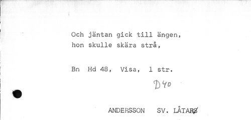 //// I //// Och jäntan gick till ängen, hon skulle skära strå, //// Bn Hd 48, Visa, 1 str. //// DVo //// ANDERSSON SV. LÅTAR# ////