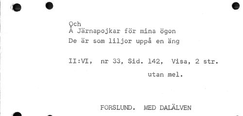 //// Och //// O //// A Järnapojkar för mina ögon De är som liljor uppå en äng //// II:VI, nr 33, Sid. 142, Visa, 2 str. //// utan mel. //// FORSLUND. MED DALÄLVEN ////