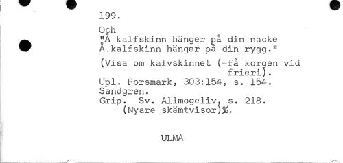 //// 199. Och //// •"A kalfskinn hänger gå din nacke A.kalfskinn hänger pa din rygg." //// (Visa om kalvskinnet (=£å korgen vid //// Upl. Forsmark, 303:154, s. 154. Sandgren. //// Grip. Sv. Allmogeliv, s. 218. (Nyare skämtvisor)^. //// ULMA ////