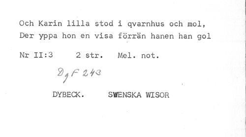 //// Och Karin lilla stod i qvarnhus och mol, //// Der yppa hon en visa förrän hanen han gol //// ' i //// Nr 11:3 2 str. Mel. not. //// 4 . //// DYBECK. SWENSKA WISOR //// j i ////