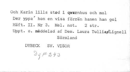 //// Och Karin lilla stod i qxnrnhus och mol Der yppa' hon en visa förrän hanen han gol Häft. II. Nr 3. Mel. not. 2 str. Uppt. o. meddelad af Dem. Laura Tullia/Lignell //// Sörmland //// DYBECK SV. VISOR ////
