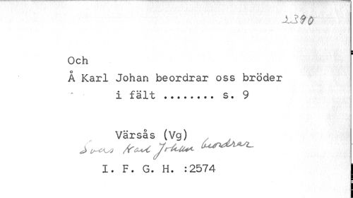 //// J.3 9 O //// Och //// Å Karl Johan beordrar oss bröder //// i fält ... s. 9 //// Värsås (Vg) I. F. G. H. :2574 ////