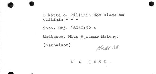 //// w w w //// O katta o. killinin döm slogs om //// •• n n t • //// vallinxn - - - //// insp. Rtj. 16060:92 a //// Mattsson, Niss Hjalmar Malung. //// (barnvisor) //// RA INSP. ////